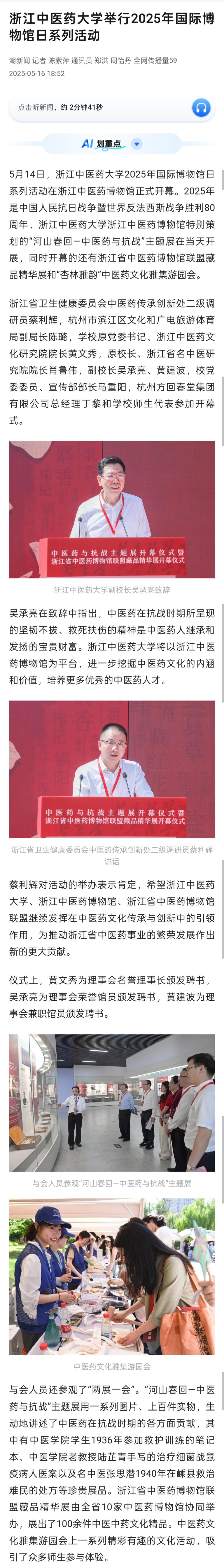 5月14日,久久精品一区二区三区四区2025年国际博物馆日系列活动在浙江中医药博物馆正式开幕。2025年是中国人民抗日战争暨世界反法西斯战争胜利80周年,久久精品一区二区三区四区浙江中医药博物馆特别策划的“河山春回—中医药与抗战”主题展在当天开展,同时开幕的还有浙江省中医药博物馆联盟藏品精华展和“杏林雅韵”中医药文化雅集游园会。